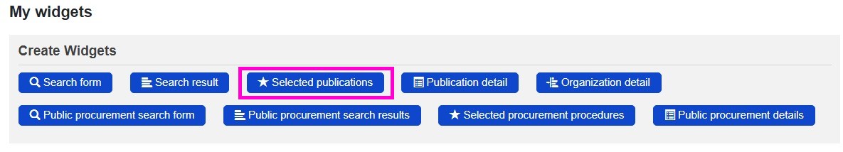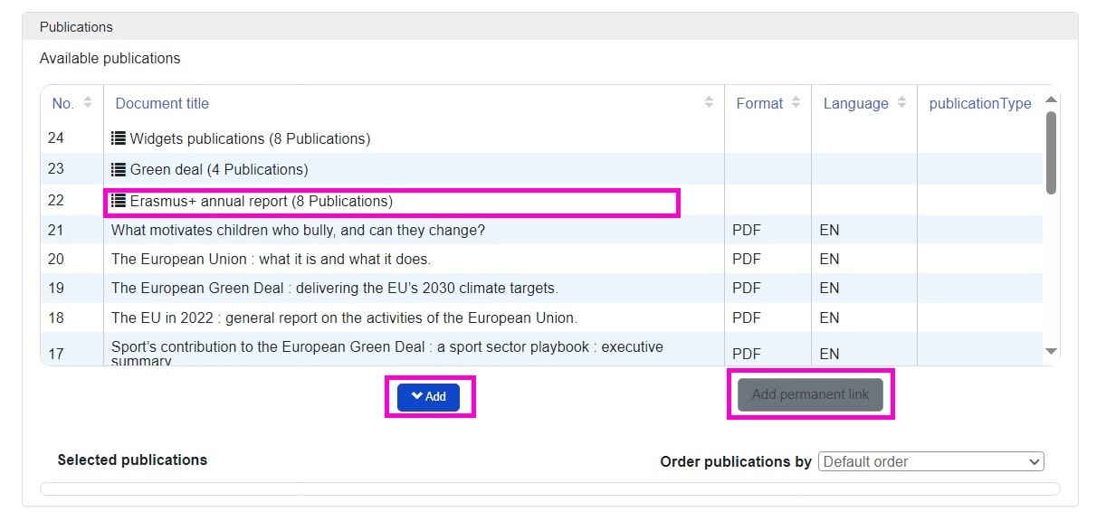 Note that there are two ways to add publications to this widget. The first is to create and save a list of publications in your profile. The second is via the "Add URL" button in the widget creator, URLs should be a property of the Publications Office portal. Example: