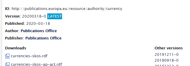 Please notice that these two queries shown above has to different authority tables mentioned by their ID (Country ID: http://publications.europa.eu/resource/authority/country and Currency ID: http://publications.europa.eu/resource/authority/currency )